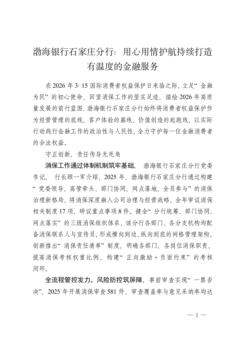 渤海银行石家庄分行:用心用情护航持续打造有温度的金融服务