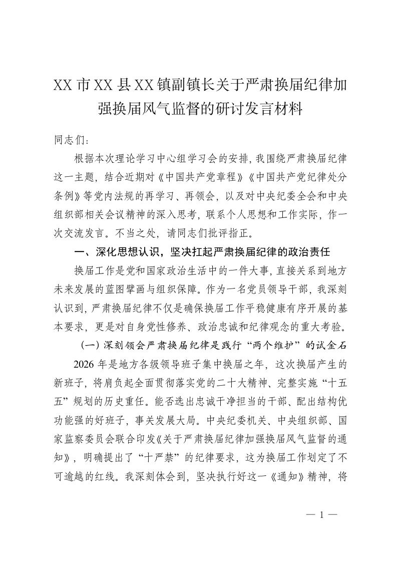 XX 市XX 县XX镇副镇长关于严肃换届纪律加强换届风气监督的研讨发言材料