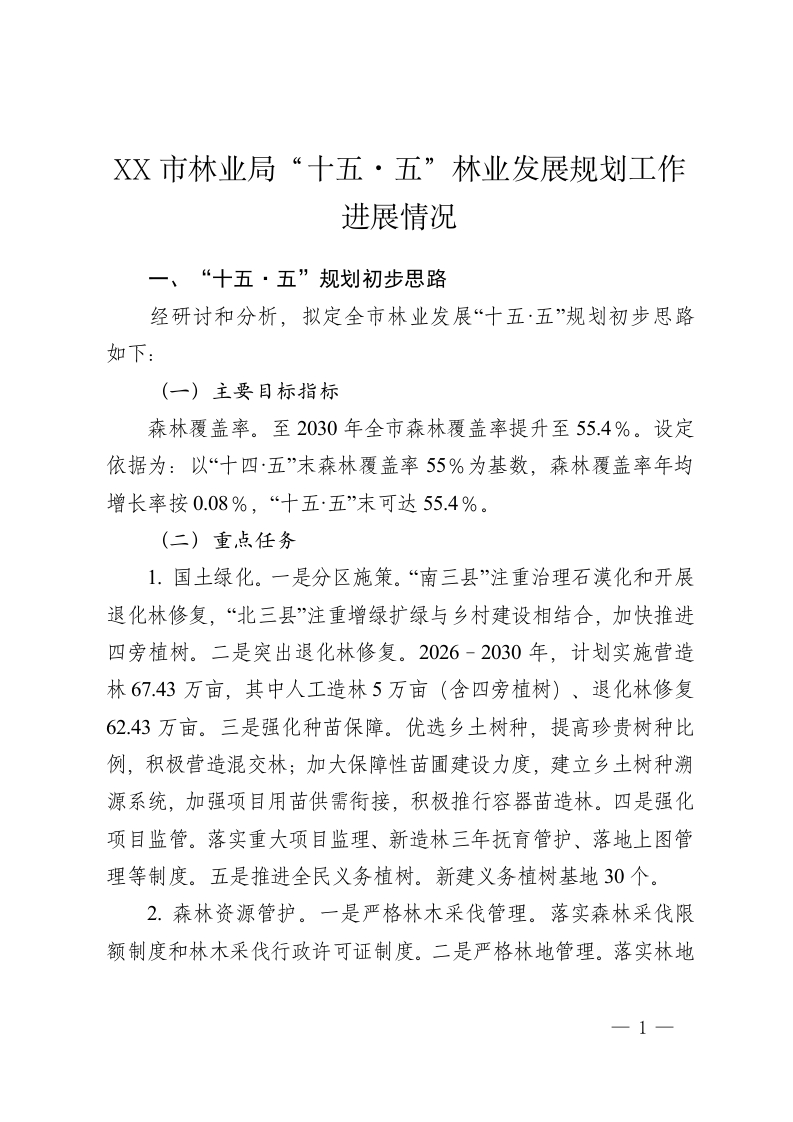 XX市林业局“十五·五”林业发展规划工作进展情况