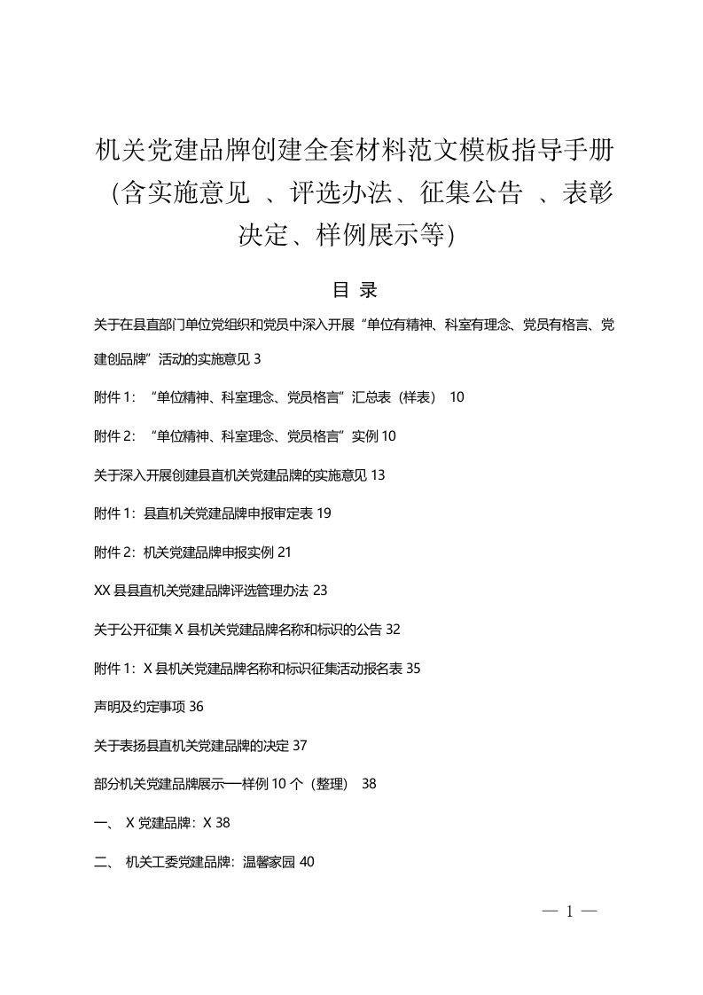 首页公文大全工作汇报机关党建品牌创建全套材料范文模板指导手册(含实施意见 、评选办法、征集公告 、表彰决定、样例展示等)