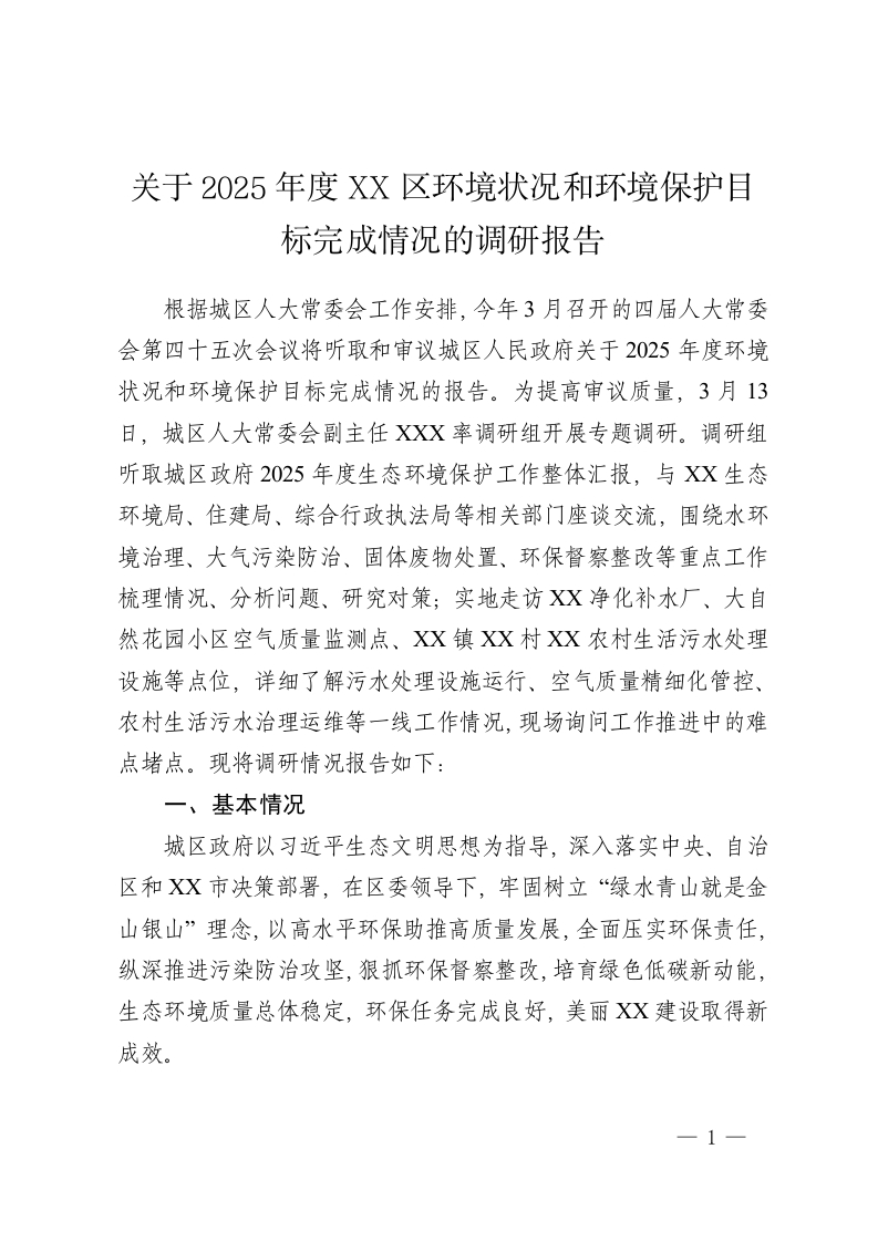 关于 2025 年度XX区环境状况和环境保护目标完成情况的调研报告