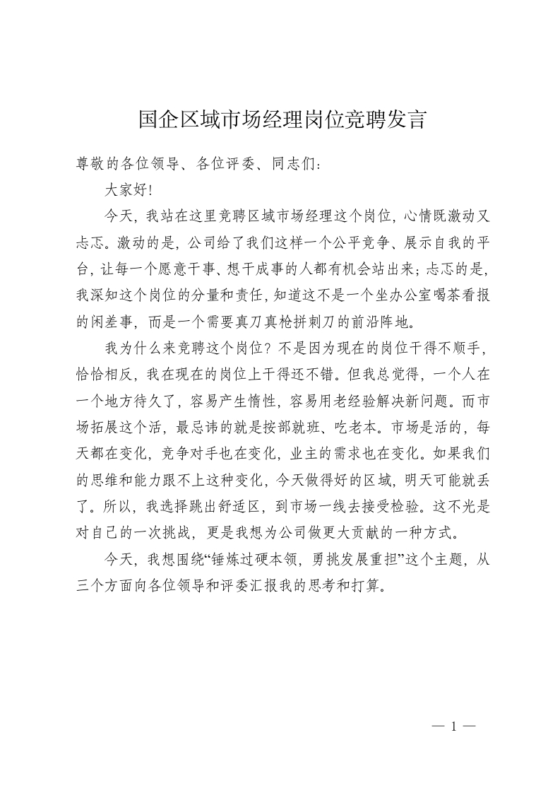 国企区域市场经理岗位竞聘发言