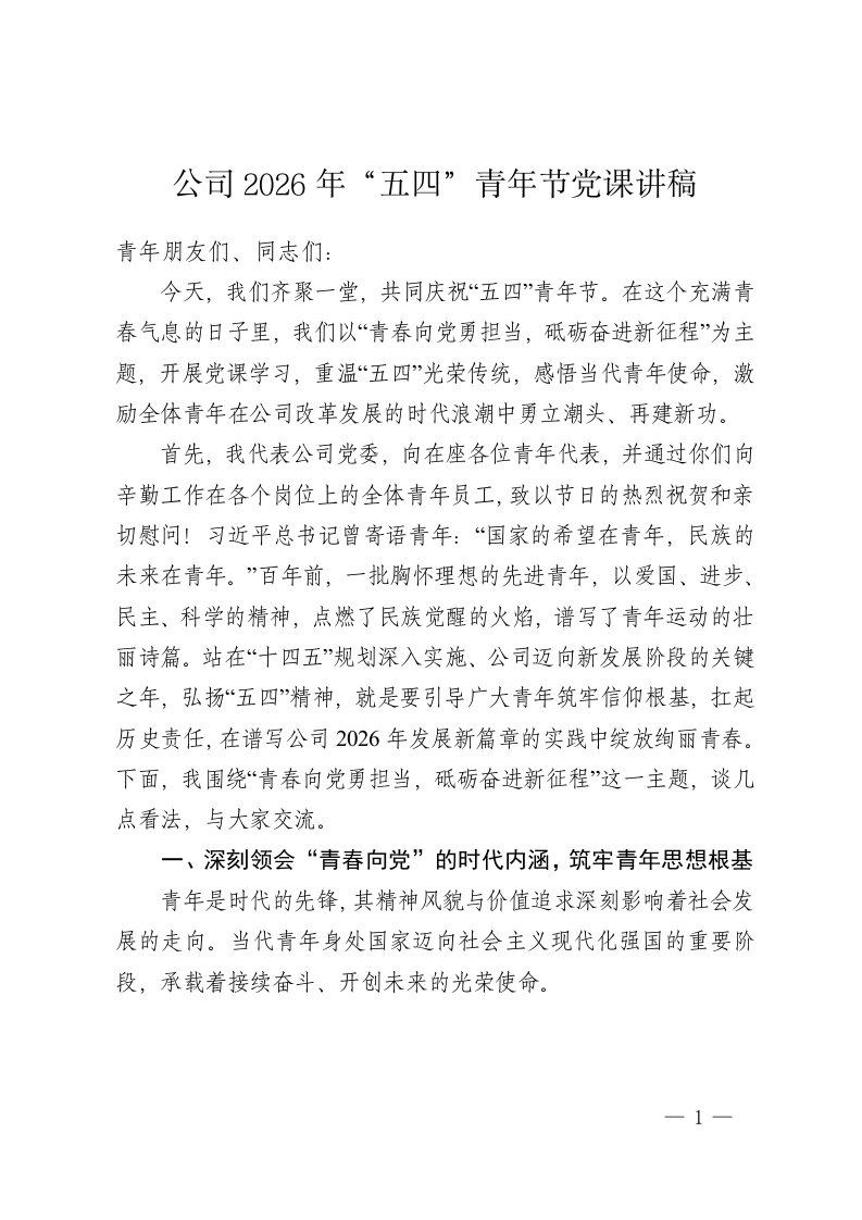 首页公文大全党课讲稿 公司2026年“五四”青年节党课讲稿