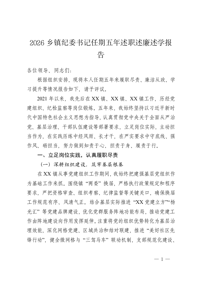 2026乡镇纪委书记任期五年述职述廉述学报告