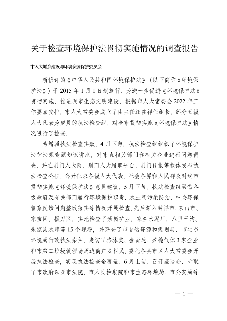 关于检查环境保护法贯彻实施情况的调查报告
