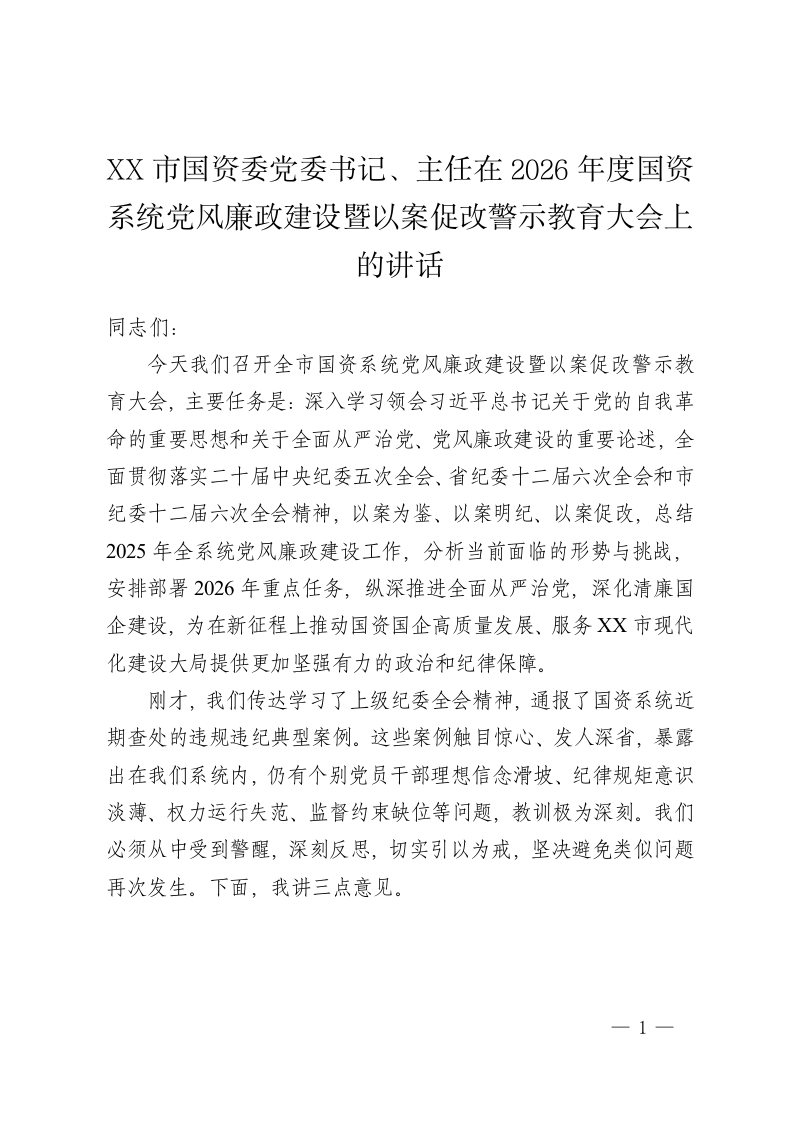 XX市国资委党委书记、主任在2026年度国资系统党风廉政建设暨以案促改警示教育大会上的讲话3