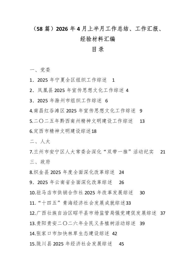 (58篇)2026年4月上半月工作总结、工作汇报、经验材料汇编