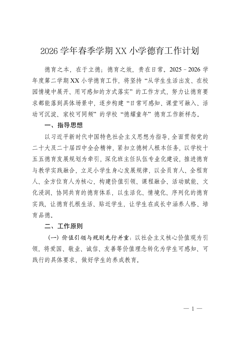 首页公文大全计划方案2026 学年春季学期XX 小学德育工作计划