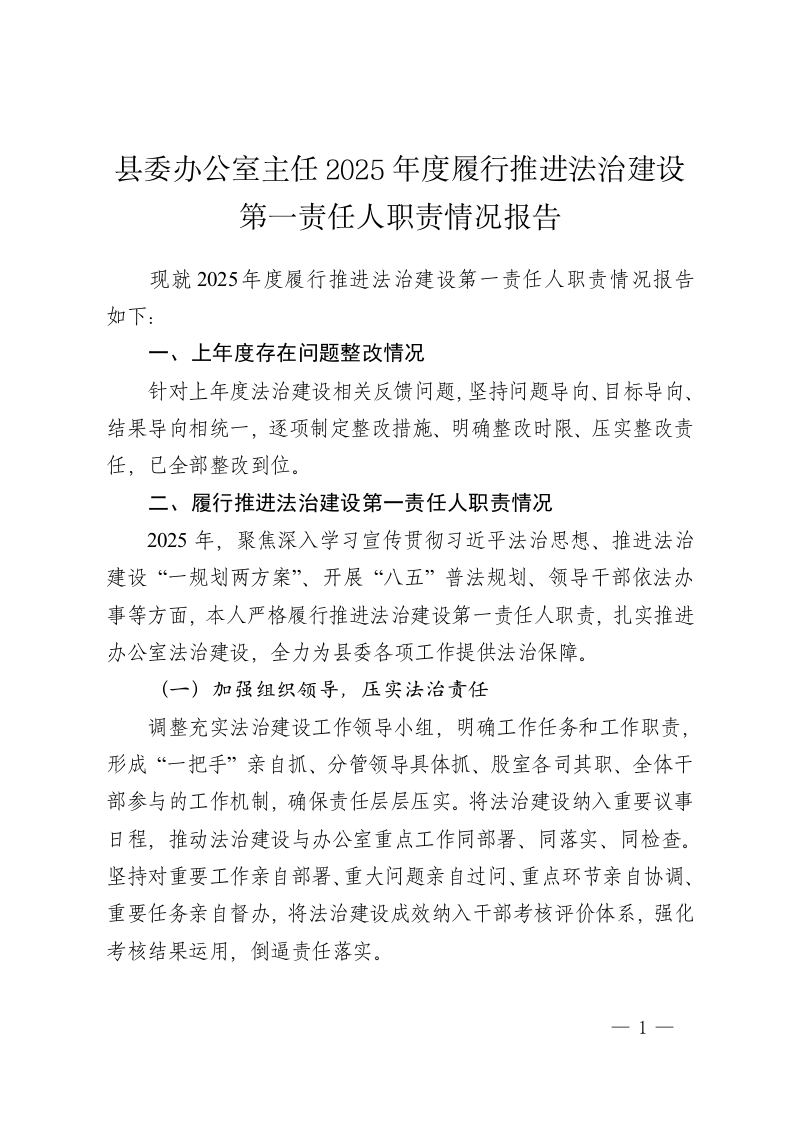 县委办公室主任 2025年度履行推进法治建设第一责任人职责情况报告