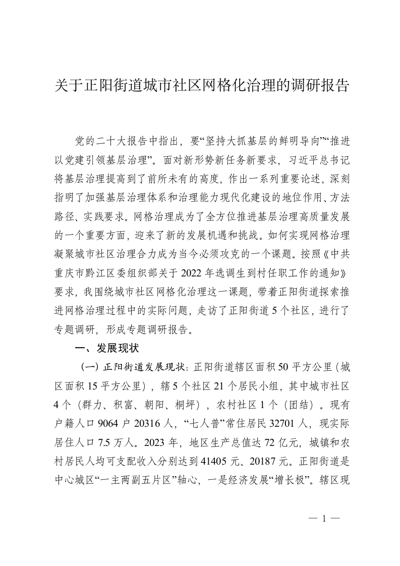 关于正阳街道城市社区网格化治理的调研报告