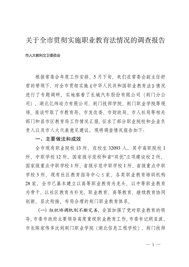 关于全市贯彻实施职业教育法情况的调查报告