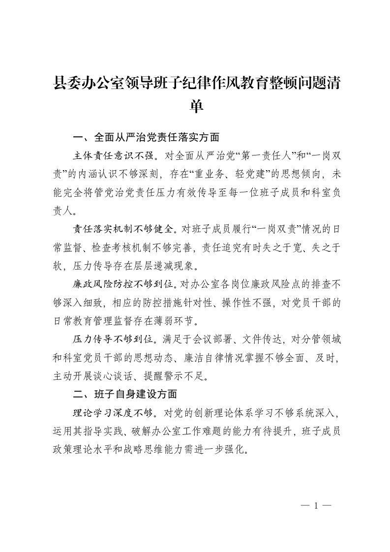 县委办公室领导班子纪律作风教育整顿问题清单