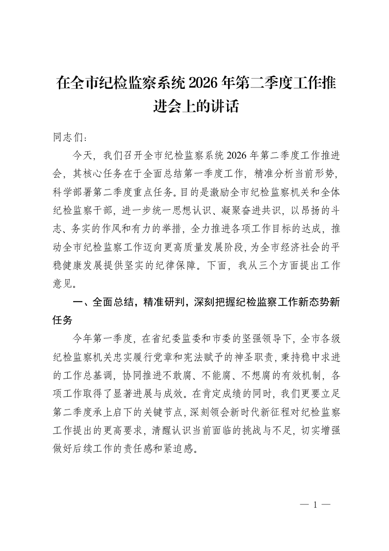 在全市纪检监察系统2026年第二季度工作推进会上的讲话