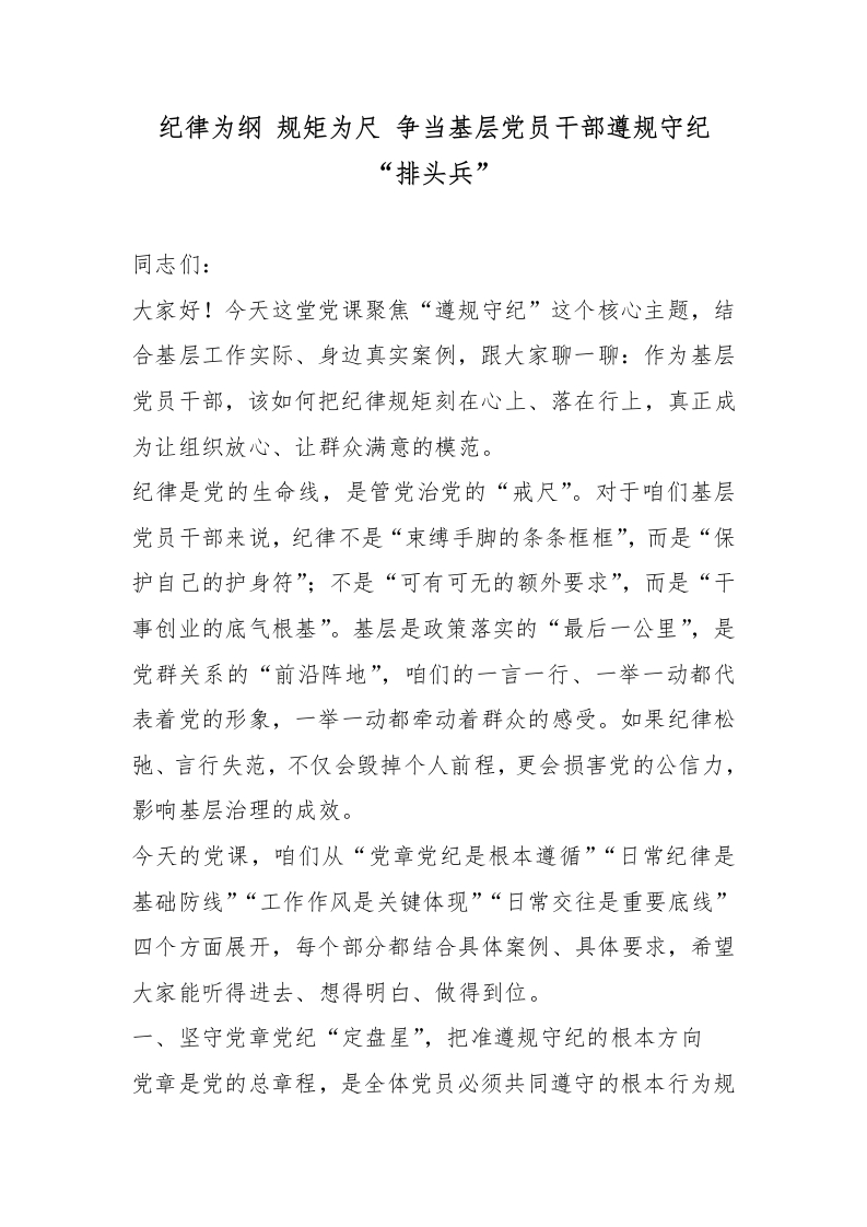 纪律为纲 规矩为尺 争当基层党员干部遵规守纪 “排头兵”
