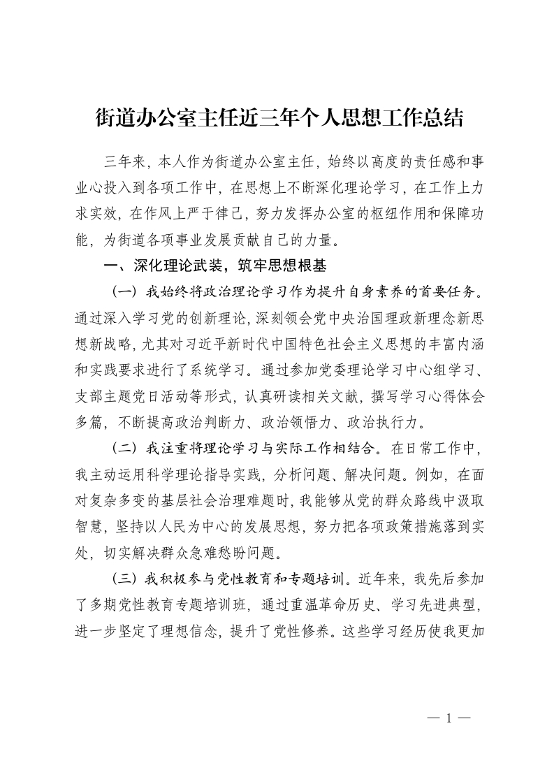 街道办公室主任近三年个人思想工作总结