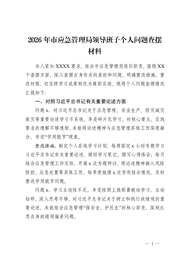 首页公文大全工作汇报2026年市应急管理局领导班子个人问题查摆材料