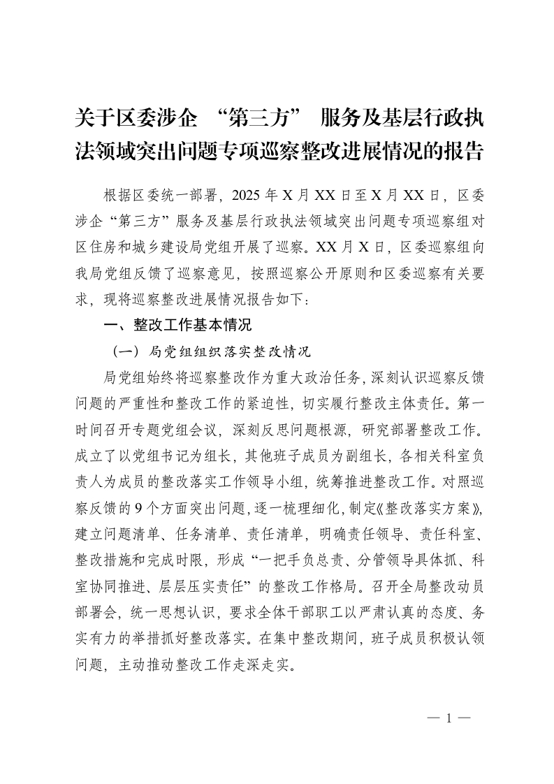 关于区委涉企 “第三方” 服务及基层行政执法领域突出问题专项巡察整改进展情况的报告
