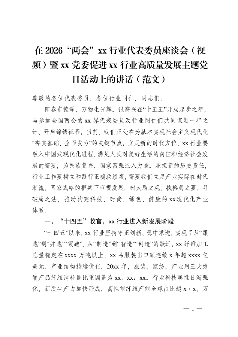 在2026“两会”xx行业代表委员座谈会(视频)暨xx党委促进xx行业高质量发展主题党日活动上的讲话(范文)