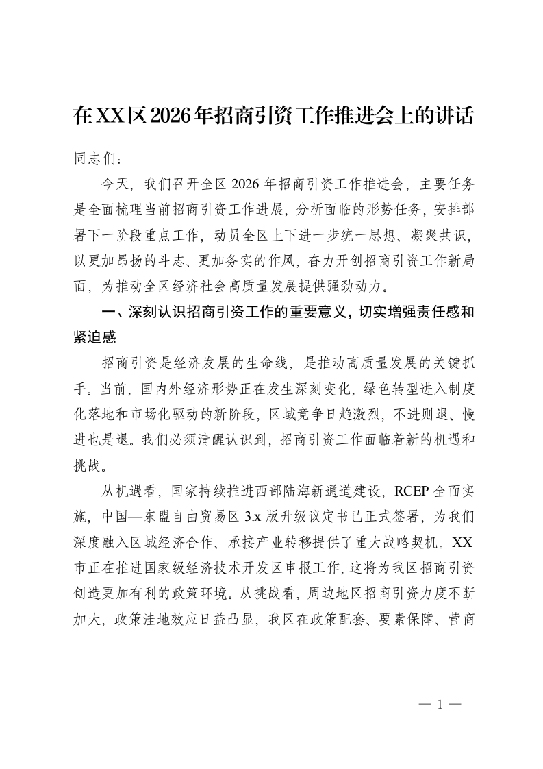首页公文大全讲话发言在XX区2026年招商引资工作推进会上的讲话