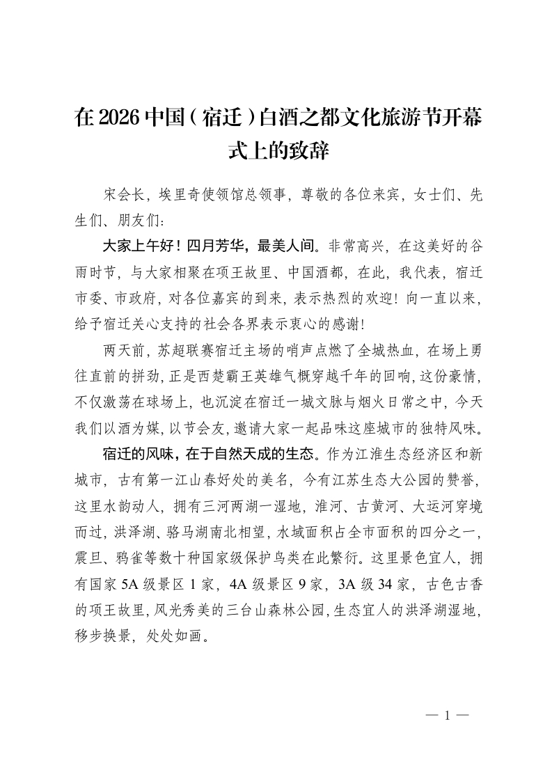 在2026中国(宿迁)白酒之都文化旅游节开幕式上的致辞