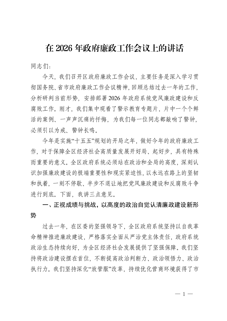 在2026年政府廉政工作会议上的讲话