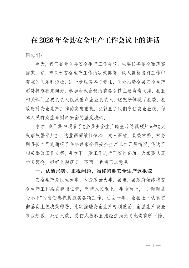 在2026年全县安全生产工作会议上的讲话