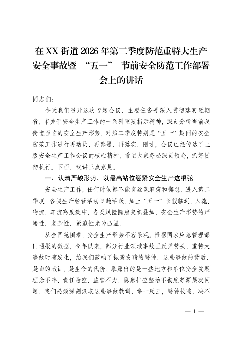 在 XX 街道2026年第二季度防范重特大生产安全事故暨 “五一” 节前安全防范工作部署会上的讲话