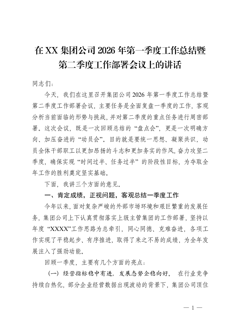 在 XX 集团公司2026年第一季度工作总结暨第二季度工作部署会议上的讲话