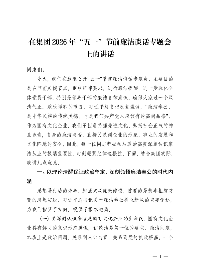 在集团2026年“五一”节前廉洁谈话专题会上的讲话