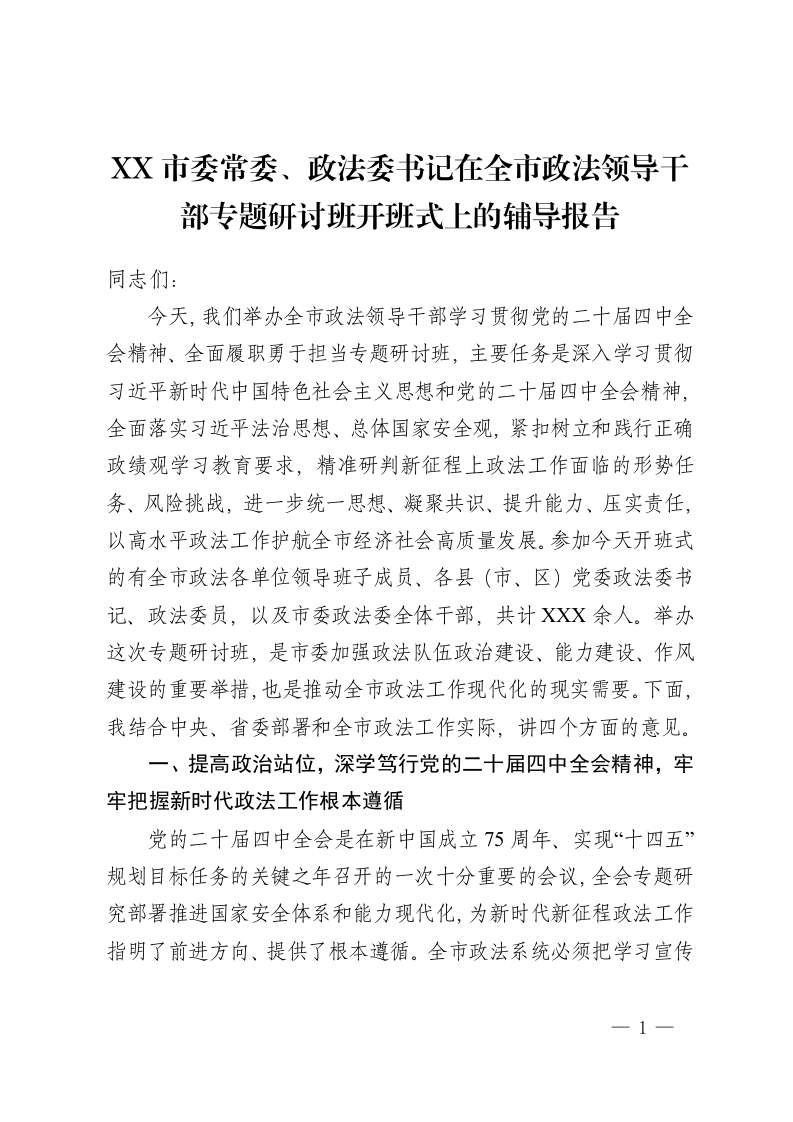 XX市委常委、政法委书记在全市政法领导干部专题研讨班开班式上的辅导报告2