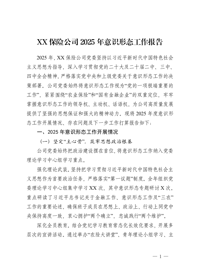 首页公文大全工作汇报XX保险公司2025年意识形态工作报告