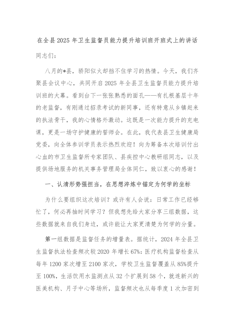 在全县2025年卫生监督员能力提升培训班开班式上的讲话