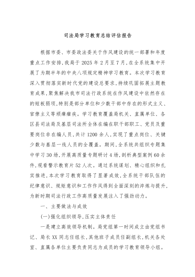 司法局学习教育总结评估报告根据市委、市委政法委关于作风建设的统一部署和年度重点工作安排,我局于2025年2月至7月,在全系统集中开展了为期半年的中央八项规定精神学习教育。本次学习教育深入贯彻落实新时代党的建设总要求,持续巩固拓展主题教育成果,聚焦解决我市司法行政系统在作风建设中依然存在的短板弱项,特别是部分单位和少数干部中存在的形式主义、官僚主义等顽瘴痼疾。学习教育覆盖局机关、直属单位、各区县司法局及基层司法所全体在编在职干部职工、党员及重要岗位非在编人员,共计1200余人,实现了重点岗位、关键少数与基层一线人员的全覆盖。期间,全系统共组织专题集中学习30场,开展高质量专题研讨4场,剖析典型案例60余件,观看警示教育片52人次。通过系统谋划、精心组织和扎实推进,本次学习教育取得了显著成效,全系统干部队伍的纪律意识、规矩意识和工作作风得到全面深刻的淬炼与提升,为新时期司法行政工作高质量发展注入了强劲动力。一、主要做法与成效(一)强化组织领导,压实主体责任一是建立高效领导机制。局党组第一时间成立由党组书记、局长XX同志任组长,其他班子成员任副组长,机关各处室、直属各单位主要负责同志为成员的学习教育领导小组。领导小组办公室设在政治部,统筹协调日常工作。结合我局实际,制定并印发了《XX市司法局关于深入开展中央八项规定精神学习教育的实施方案》,明确了动员部署、学习研讨、查摆问题、整改落实、总结评估五个关键阶段的路线图、时间表和责任书,确保学习教育有章可循、有序推进。二是层层压实工作责任。建立“党组统一领导、主要领导负总责、分管领导分工负责、职能部门牵头抓总、基层单位具体落实”的责任体系。局党组班子成员分别建立基层联系点,定期到分管领域和基层单位督导检查,形成“领导班子包片、处室负责人包岗、党支部书记包人”的网格化责任链条。同时,将学习教育开展情况与成效纳入各单位年度党风廉政建设责任制考核和领导班子绩效考核,对思想不重视、行动迟缓、效果不彰的单位和个人进行严肃通报,有效传导了压力,激发了内生动力。三是坚持领导示范带动。局党组班子成员以身作则、率先垂范,坚持先学一步、学深一层。在学习教育期间,党组理论学习中心组带头开展了5次专题学习,班子成员均带头撰写心得体会,并在全局干部大会上作交流发言。同时,班子成员带头深入基层一线开展调研,围绕分管领域存在的作风问题,牵头制定整改方案,亲自督办落实。在领导班子的示范引领下,全系统迅速形成上行下效、整体联动的良好局面,中层干部主动认领任务,基层党员积极参与,营造了浓厚的学习氛围。(二)深化学习研讨,筑牢思想根基一是聚焦主题“学”。坚持把学习贯彻中央八项规定及其实施细则精神作为首要任务,组织全体人员原原本本、逐字逐句学习规定原文,深刻领会其精神实质和核心要义。通过举办专题读书班、邀请市纪委监委专家作专题辅导报告等形式,系统学习了习近平总书记关于作风建设的重要论述。各党支部以“三会一课”为基本载体,围绕“作风建设永远在路上”等主题开展专题讨论,确保学习内容入脑入心。二是创新载体“活”。针对不同群体的特点,积极探索灵活多样的学习方式。面向基层司法所和窗口单位,利用“班前十分钟”推出“作风微课堂”,学习一个案例、重温一条纪律。面向青年干部,组织开展线上知识竞赛和“青年话作风”主题征文活动,激发学习热情。针对部分行动不便的退休老党员,组织青年志愿者“送学上门”,确保学习教育不留死角、不漏一人。三是强化警示“醒”。坚持用身边事教育身边人,组织全体干部职工集中观看了《作风建设永远在路上》《警钟长鸣》等警示教育专题片。在此基础上,深入剖析近年来本系统及政法系统内发生的违反中央八项规定精神的典型案例,编印《警示教育案例选编》,组织召开警示教育大会,由违纪人员所在单位主要负责人在会上作深刻检查,用“活教材”给全