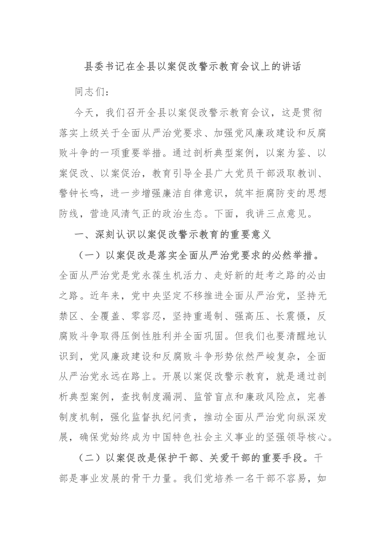 县委书记在全县以案促改警示教育会议上的讲话同志们:今天,我们召开全县以案促改警示教育会议,这是贯彻落实上级关于全面从严治党要求、加强党风廉政建设和反腐败斗争的一项重要举措。通过剖析典型案例,以案为鉴、以案促改、以案促治,教育引导全县广大党员干部汲取教训、警钟长鸣,进一步增强廉洁自律意识,筑牢拒腐防变的思想防线,营造风清气正的政治生态。下面,我讲三点意见。一、深刻认识以案促改警示教育的重要意义(一)以案促改是落实全面从严治党要求的必然举措。全面从严治党是党永葆生机活力、走好新的赶考之路的必由之路。近年来,党中央坚定不移推进全面从严治党,坚持无禁区、全覆盖、零容忍,坚持重遏制、强高压、长震慑,反腐败斗争取得压倒性胜利并全面巩固。但我们也要清醒地认识到,党风廉政建设和反腐败斗争形势依然严峻复杂,全面从严治党永远在路上。开展以案促改警示教育,就是通过剖析典型案例,查找制度漏洞、监管盲点和廉政风险点,完善制度机制,强化监督执纪问责,推动全面从严治党向纵深发展,确保党始终成为中国特色社会主义事业的坚强领导核心。(二)以案促改是保护干部、关爱干部的重要手段。干部是事业发展的骨干力量。我们党培养一名干部不容易,如果因为违纪违法而受到惩处,不仅对个人和家庭造成巨大伤害,也会给党和人民的事业带来损失。开展以案促改警示教育,就是要给广大党员干部敲响警钟,让大家明白“莫伸手,伸手必被捉”的道理,自觉遵守党纪国法,不越红线、不触底线。通过早提醒、早预防,让干部少犯错误、不犯错误,保护干部健康成长,激发干部干事创业的积极性和主动性。(三)以案促改是推动全县经济社会高质量发展的有力保障。当前,我县正处于加快发展的关键时期,各项事业蓬勃发展,但也面临着诸多困难和挑战。要实现经济社会高质量发展,必须有一个风清气正的政治生态和干事创业的良好环境。开展以案促改警示教育,能够有效整治干部作风中存在的突出问题,提高干部的执行力和工作效率,增强干部的责任感和使命感。让广大干部把心思和精力集中到干事创业上来,形成心齐、气顺、劲足的良好局面,为全县经济社会发展提供坚强保障。二、深刻剖析典型案例,汲取惨痛教训(一)剖析理想信念缺失的根源。从近年来查处的典型案例来看,一些党员干部之所以走上违纪违法的道路,根本原因在于理想信念动摇、宗旨意识淡薄。他们忘记了为人民服务的初心使命,背离了党的性质和宗旨,把党和人民赋予的权力当作谋取私利的工具。有的干部在面对各种诱惑时,丧失了政治立场和原则,与不法商人勾肩搭背、沆瀣一气,最终陷入腐败的泥潭。这警示我们,理想信念是共产党人精神上的“钙”,没有理想信念,理想信念不坚定,精神上就会“缺钙”,就会得“软骨病”。广大党员干部必须坚定理想信念,加强党性修养,始终保持对党的忠诚、对人民的赤诚。(二)剖析纪律规矩意识淡薄的危害。纪律是管党治党的“戒尺”,也是党员干部约束自身行为的标准和遵循。但一些党员干部却无视纪律规矩,心存侥幸,肆意妄为。他们违反党的政治纪律、组织纪律、廉洁纪律、群众纪律、工作纪律和生活纪律,给党和人民的事业造成严重损害。有的干部在工程项目建设中违规插手干预,收受贿赂:有的干部在扶贫领域优亲厚友、虚报冒领,侵害群众利益。这些行为严重破坏了党的形象,损害了党群干群关系。广大党员干部要时刻绷紧纪律这根弦,自觉遵守党的各项纪律规矩,做到心有所畏、言有所戒、行有所止。(三)剖析监督制约机制不完善的问题。权力失去监督制约,必然导致腐败。一些典型案例暴露出我们在监督制约机制方面还存在漏洞和不足。有的单位内部监督流于形式,对权力运行缺乏有效的制约和监督;有的部门之间协调配合不够,信息沟通不畅,导致监督合力不足;有的对“一把手”的监督存在薄弱环节,出现“上级监督太远、同级监督太软、下级监督太难”的现象。这些问题使得一些干部有机可乘,