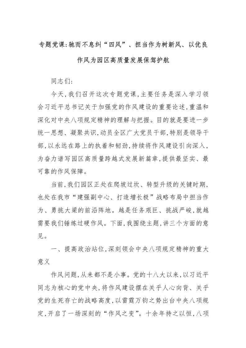 专题党课:驰而不息纠“四风”、担当作为树新风、以优良作风为园区高质量发展保驾护航同志们:今天,我们召开这次专题党课,主要任务是深入学习领会习近平总书记关于加强党的作风建设的重要论述,重温和深化对中央八项规定精神的理解与把握。目的就是要进一步统一思想、凝聚共识,动员全区广大党员干部,特别是领导干部,以永远在路上的执着和韧劲,持续将作风建设引向深入,为奋力谱写园区高质量跨越式发展新篇章,提供最坚实、最可靠的作风保障。当前,我们园区正处在爬坡过坎、转型升级的关键时期,也处在我市“建强副中心、打造增长极”战略布局中担当作为、勇挑大梁的前沿阵地。越是任务艰巨、挑战严峻,就越需要我们锤炼过硬作风。下面,我围绕主题,讲三个方面的意见。一、提高政治站位,深刻领会中央八项规定精神的重大意义作风问题,从来都不是小事。党的十八大以来,以习近平同志为核心的党中央,将作风建设摆在关乎人心向背、关乎党的生死存亡的战略高度,以雷霆万钧之势出台中央八项规定,开启了一场深刻的“作风之变”。十余年持之以恒,八项规定已经成为新时代中国共产党人激浊扬清、革故鼎新的“金色名片”。我们必须从历史、时代和实践三个维度,深刻认识其丰富内涵和重大意义。(一)从历史维度看,这是我们党永葆先进性纯洁性的“自我革命”我们党历来高度重视作风建设。从“三大纪律、八项注意”到“两个务必”,再到新时代的中央八项规定,一部党的发展史,就是一部不断加强自我净化、自我完善、自我革新、自我提高的作风建设史。八项规定,看似只是几条简单的规定,却蕴含着深刻的政治考量。它继承了我们党“讲认真”的优良传统,体现了“从严治党”的坚定决心,更彰显了“刀刃向内”的革命勇气。回顾八项规定出台以来的历程,可谓是“徙木立信”的生动实践。它从小切口入手,解决的却是大问题;从具体事抓起,改变的却是大风气。它刹住了一些过去被认为不可能刹住的歪风,攻克了一些过去司空见惯的顽瘴痼疾,使党风政风为之一新,社风民风向上向善。这充分证明,只要我们党下定决心,就没有解决不了的问题,就没有克服不了的困难。对于我们园区而言,每一位党员干部都要从党的百年奋斗史中汲取智慧和力量,深刻认识到作风建设是党的生命线,是凝聚党心民心的重要法宝,必须常抓不懈、久久为功。(二)从时代维度看,这是新征程上行稳致远的“压舱之石”当今世界正经历百年未有之大变局,我国发展进入战略机遇和风险挑战并存、不确定难预料因素增多的时期。我们园区的发展同样面临着前所未有的机遇和挑战。机遇在于,市委市政府对园区寄予厚望,赋予我们打造XX新区、建设XX产业高地的重任;挑战在于,宏观经济环境复杂多变,区域竞争日趋激烈,产业转型升级压力巨大。越是在这样的背景下,优良的作风就越是事业发展的“压舱之石”。一个地方的发展,短期看项目,中期看政策,长期看环境,而环境的核心就是作风。试想,如果一个地方官僚主义盛行,企业办事“门难进、脸难看、事难办”,客商怎么会来投资?如果一个地方形式主义泛滥,政策悬在空中,项目落在纸上,发展又从何谈起?近年来,我们园区经济社会发展取得了显著成绩。从数据上看,我们的地区生产总值从2022年的3100亿元,增长到2024年的3850亿元,年均增速超过7%,今年有望突破4500亿元大关。产业结构持续优化,三次产业结构由2022年的0.5:55.5:44.0,调整为2024年的0.3:51.2:48.5,第三产业占比显著提升,特别是以新一代信息技术、生物医药、人工智能为主的战略性新兴产业产值占规上工业总产值比重已达55%。固定资产投资保持高位运行,近三年累计完成投资超过3000亿元,XX新材料基地、XX智能制造产业园等一批百
