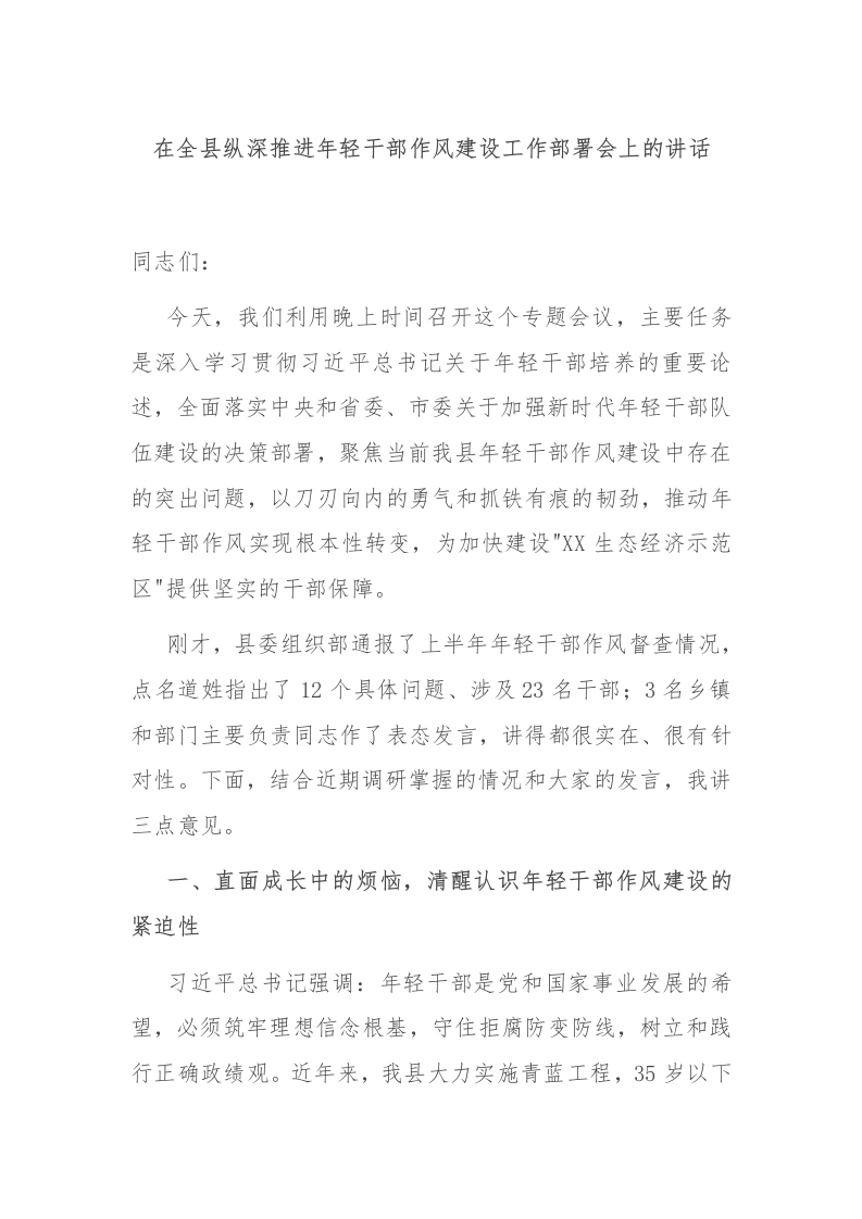 在全县纵深推进年轻干部作风建设工作部署会上的讲话同志们:今天,我们利用晚上时间召开这个专题会议,主要任务是深入学习贯彻习近平总书记关于年轻干部培养的重要论述,全面落实中央和省委、市委关于加强新时代年轻干部队伍建设的决策部署,聚焦当前我县年轻干部作风建设中存在的突出问题,以刀刃向内的勇气和抓铁有痕的韧劲,推动年轻干部作风实现根本性转变,为加快建设"XX生态经济示范区"提供坚实的干部保障。刚才,县委组织部通报了上半年年轻干部作风督查情况,点名道姓指出了12个具体问题、涉及23名干部;3名乡镇和部门主要负责同志作了表态发言,讲得都很实在、很有针对性。下面,结合近期调研掌握的情况和大家的发言,我讲三点意见。一、直面成长中的烦恼,清醒认识年轻干部作风建设的紧迫性习近平总书记强调:年轻干部是党和国家事业发展的希望,必须筑牢理想信念根基,守住拒腐防变防线,树立和践行正确政绩观。近年来,我县大力实施青蓝工程,35岁以下科级干部占比从2021年的18.6%提升到现在的25.3%,在疫情防控、乡村振兴、项目建设等一线涌现出了一批90后担当者,比如XX镇副镇长李XX牵头打造的稻渔共生示范基地,带动周边3个村集体年增收超50万元;县政务服务中心85后主任张XX推动一窗通办改革,审批时限压缩60%,群众满意度从89%提升到97%。这些成绩值得肯定,但更要清醒看到,对照可堪大用、能担重任的要求,年轻干部作风还存在不少短板弱项。有的干部躺平心态抬头,把躺平当躺赢。今年6月督查发现,XX乡2名30岁左右的包村干部,将入户走访变成拍照留痕,连续3个月未走访脱贫户王大爷家,却在台账里写了12次深入交流;县农业农村局1名90后业务骨干,负责高标准农田建设项目时,以资料整理需要时间为由,将本该30天完成的竣工材料拖了58天,被省农业农村厅通报批评。更令人担忧的是,个别干部把佛系挂在嘴边,觉得干多干少一个样,在本该冲锋的项目攻坚中出现掉链子现象。有的干部悬浮作风突出,把调研当作秀。县委党校课题组近期访谈了50名年轻干部,其中32人坦言下基层怕吃苦,习惯坐在车里转、隔着玻璃看;XX街道88后副主任陈某,今年开展的社区治理调研,15份问卷中有12份是在自己办公室让同事代填的,调研报告里竟出现农村老人普遍使用智能手机的荒谬结论。这种脚不沾泥的作风,导致政策制定与群众需求两张皮,比如去年出台的农树电商扶持政策,因为没深入调研物流短板,最终落地效果打了折扣。有的干部功利思想滋生,把平台当本事。今年县委组织部开展干部家访时发现,个别年轻干部把组织的培养视为个人资本,在与群众交流时口大气粗,甚至在酒桌上抱怨基层苦、基层累,不如在县直机关当'老爷';还有少数干部把岗位当作跳板,对长期积累的基础工作敷衍塞责,一门心思琢磨怎么尽快调回城里怎么争取晋升机会。这种现象虽然是个别,但严重损害了党和政府在群众中的形象。同志们,年轻干部的作风问题,表面看是个人修养不够,本质上是对我是谁、为了谁、依靠谁的根本立场动摇。这些问题如果不及时解决,不仅会影响年轻干部个人成长,更会贻误事业发展大局。我们必须以时时放心不下的责任感,把作风建设作为年轻干部成长的必修课,抓早抓小、防微杜渐。二、锚定致广大而尽精微,系统构建作风建设的长效机制作风建设重在常长二字。要坚持问题导向、目标导向、结果导向,从思想教育、实践锻炼、考核评价等环节入手,打出组合拳,推动年轻干部作风持续向好。第一,以铸魂为本,让扎根基层成为思想自觉。思想是行动的先导。要把学习贯彻习近平新时代中国特色社会主义