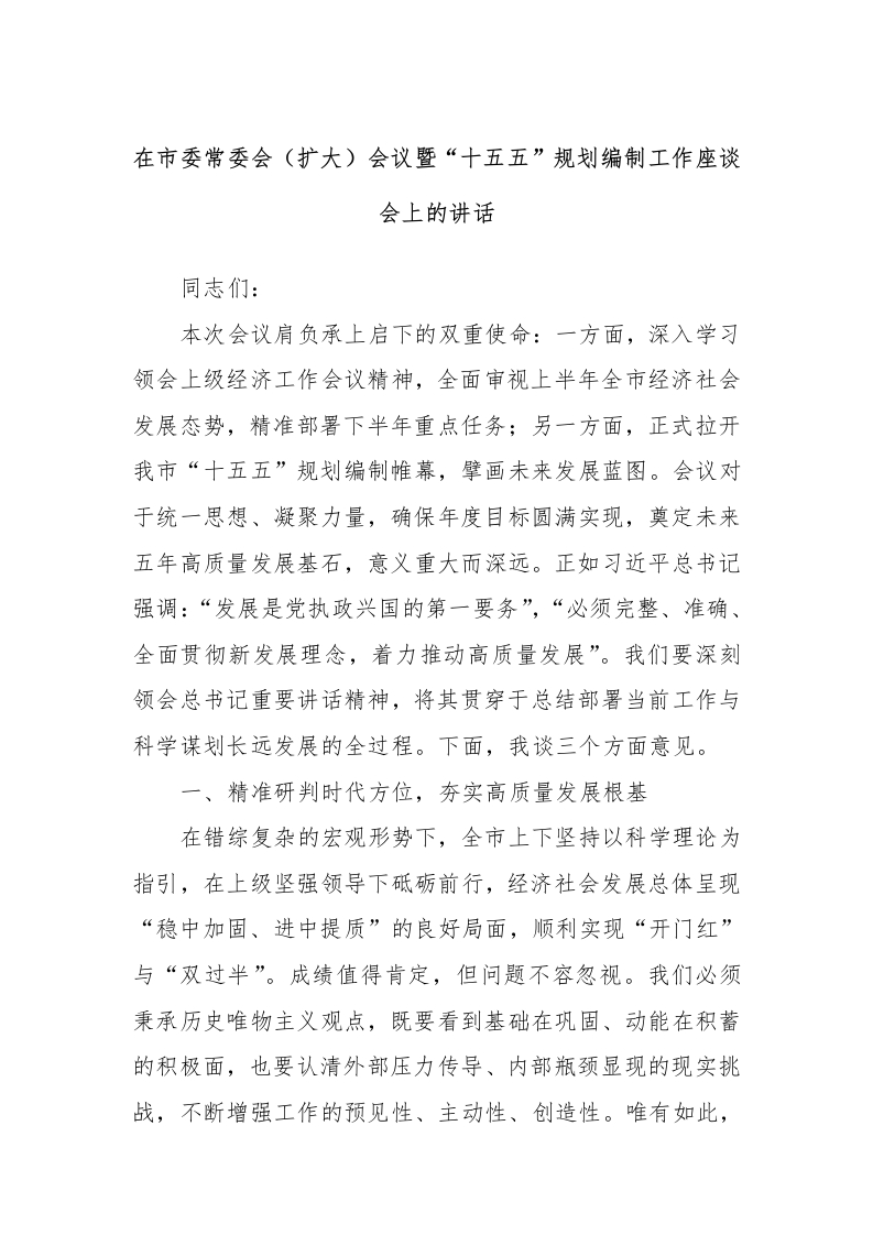 在市委常委会(扩大)会议暨“十五五”规划编制工作座谈会上的讲话同志们:本次会议肩负承上启下的双重使命:一方面,深入学习领会上级经济工作会议精神,全面审视上半年全市经济社会发展态势,精准部署下半年重点任务;另一方面,正式拉开我市“十五五”规划编制帷幕,擘画未来发展蓝图。会议对于统一思想、凝聚力量,确保年度目标圆满实现,奠定未来五年高质量发展基石,意义重大而深远。正如习近平总书记强调:“发展是党执政兴国的第一要务”,“必须完整、准确、全面贯彻新发展理念,着力推动高质量发展”。我们要深刻领会总书记重要讲话精神,将其贯穿于总结部署当前工作与科学谋划长远发展的全过程。下面,我谈三个方面意见。一、精准研判时代方位,夯实高质量发展根基在错综复杂的宏观形势下,全市上下坚持以科学理论为指引,在上级坚强领导下砥砺前行,经济社会发展总体呈现“稳中加固、进中提质”的良好局面,顺利实现“开门红”与“双过半”。成绩值得肯定,但问题不容忽视。我们必须秉承历史唯物主义观点,既要看到基础在巩固、动能在积蓄的积极面,也要认清外部压力传导、内部瓶颈显现的现实挑战,不断增强工作的预见性、主动性、创造性。唯有如此,才能准确识变、科学应变、主动求变,牢牢掌握发展主动权。本版块重点在于客观评估形势,洞悉规律特征,为后续工作奠定坚实认知基础。(一)经济运行呈现新活力,发展底盘稳步加固上半年经济大盘企稳向好的态势,是全体干群戮力同心的结晶。关键经济指标运行在合理区间,部分指标增速位居区域前列,反映出我市经济体系韧性强、回旋空间大、潜力足的基本面没有改变。工业运行指标稳健,有效巩固了经济基本面。投资需求持续释放,为稳增长提供了关键支撑。消费市场活力复苏,内需引擎作用逐步增强。究其根本,在于我们始终坚持产业立市战略,深入推行旨在优化要素配置、提升服务效能的核心工程。在获取优质资本资源方面,我们精准对接国家政策导向,争取上级转移支付与专项资金取得显著进展。政务服务改革深入推进,“一站式”服务平台效能不断提升,重大项目全程保障机制持续优化,土地要素供给效率显著提高,为产业项目快落地、早见效提供了有力支撑。(二)动能转换塑造新优势,产业质效稳步跃升产业是现代经济体系的核心支柱。上半年,我们聚焦提质增效升级,产业结构加速向中高端迈进,新旧动能转换步伐加快。重点优势产业领域呈现出技术密集、附加值提升、竞争力增强的良好发展势头,成为支撑增长的中坚力量。在战略新兴产业的培育上取得了突破性进展,产能释放与技术突破同步显现,产业链条延伸和价值链攀升的特征日益突出。传统产业的转型升级加速推进,数字化转型与智能制造广泛渗透。通过智能化改造、绿色化提升、精益化管理等手段,使大量传统制造企业生产效率、产品质量、管理水平得到系统改善。技术创新主体地位持续强化,创新策源能力正在加速形成。这些成就不仅实现了经济规模的扩容,更驱动了发展质量的提升,为构建现代化产业体系提供了澎湃动能。(三)风险挑战亟需新作为,前行征途仍需闯关在肯定成绩的同时,必须清醒认识到,前进道路绝非坦途,发展征程仍多艰险。从宏观层面审视,全球格局深度调整,国内经济转型阵痛持续,宏观环境复杂性、严峻性、不确定性不减,区域竞争呈现白热化态势。从省市层面考量,经济总量增长承压态势未消,新旧动能转换的拉锯期仍在持续。从我市自身剖析,深层次结构性矛盾依然突出:产业能级整体偏低的瓶颈尚未完全突破,核心竞争力亟待提升;科技创新投入与成果转化效率仍有较大提升空间,支撑高质量发展的引擎不够强劲:部分市场主体经营压力增大,有效需求提振需持续发力;公共服务供给与均衡性水平与人民日益增长的美好生活需要之间尚存差距。对此,我们必须增强忧患意识,坚持问题导向,下大力气解决发展不平衡不充分问题,为高质量发展扫清障碍。