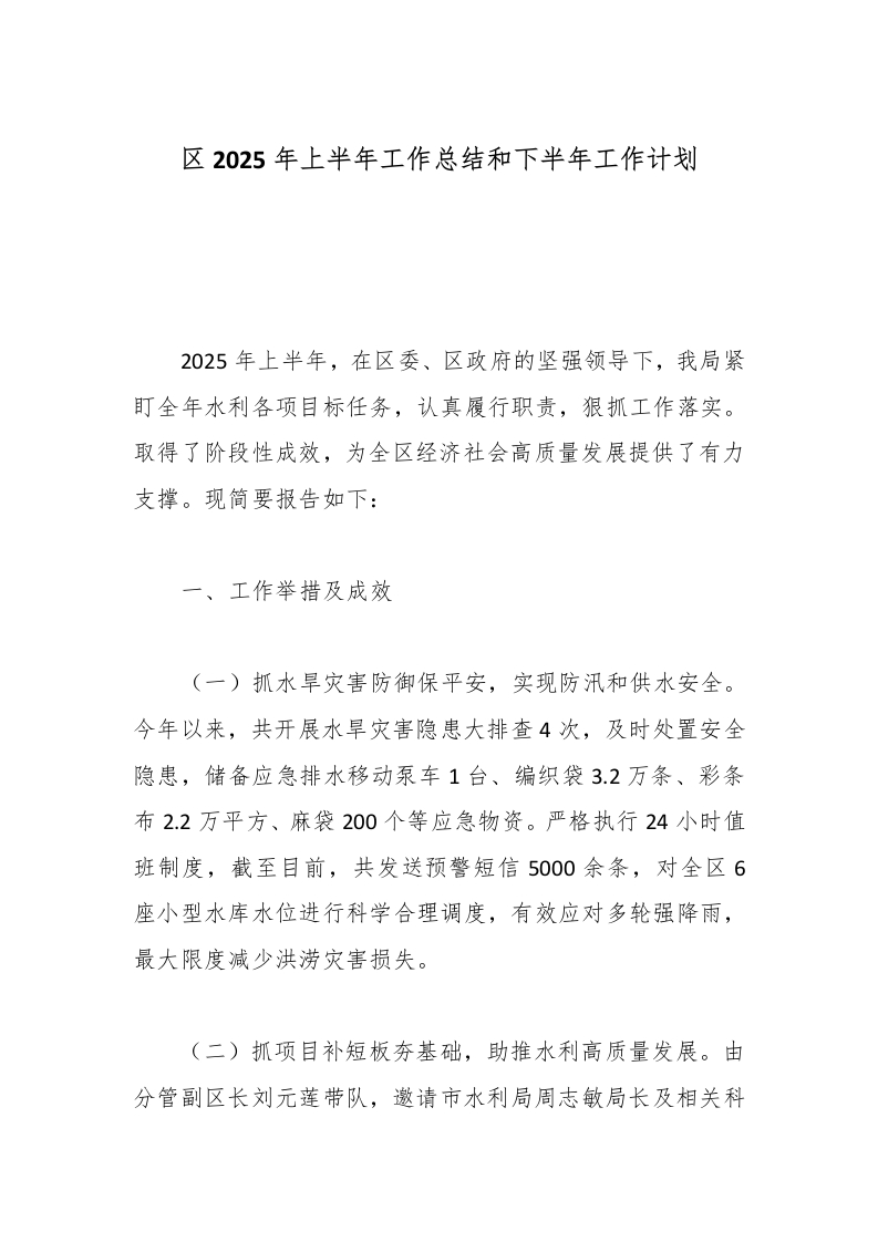 区2025年上半年工作总结和下半年工作计划2025年上半年,在区委、区政府的坚强领导下,我局紧盯全年水利各项目标任务,认真履行职责,狠很抓工作落实。取得了阶段性成效,为全区经济社会高质量发展提供了有力支撑。现简要报告如下:一、工作举措及成效(一)抓水旱灾害防御保平安,实现防汛和供水安全。今年以来,共开展水旱灾害隐患大排查4次,及时处置安全隐患,储备应急排水移动泵车1台、编织袋3.2万条、彩条布2.2万平方、麻袋200个等应急物资。严格执行24小时值班制度,截至目前,共发送预警短信5000余条,对全区6座小型水库水位进行科学合理调度,有效应对多轮强降雨,最大限度减少洪涝灾害损失。(二)抓项目补短板夯基础,助推水利高质量发展。由分管副区长刘元莲带队,邀请市水利局周志敏局长及相关科室赴省水利厅争资跑项。2025年已争取到位水利资金354万元,其中移民中央资金201万元,水利设施维修养护中央资金93万元,重点民生实事小型农田水利设施建设省级奖补资金60万元。全面完成4个水利项目建设任务,其中国债项目3个(寒剑锋水闸除险加固工程、鸡市河重点山洪沟治理工程、松陂水库雨水情监测项目),市级投资项目一个(代背河四期治理项目)。新建840千瓦新民排渍泵站1处,该项目中标价X万元,力争8月底完工。(三)抓水利行业治理强监管,持续提升管理水平。全区44名河长,层层压实河流管护、治理主体责任,落实区一镇(街)一村(社区)三级河长巡河要求,实现流域巡查全覆盖,开展巡河共计404次,维护了河流生态安全。开展河段信息复核、完成水普外河湖划界工作,进行河湖健康评价前期摸底工作。完成上级交办的河流"清四乱"图斑核查3处。(四)抓民生水利建设惠民生,助力乡村全面振兴。完成18口一般山塘清淤扩容,新增蓄水面积4万立方米,泵站维修4处。扎实开展移民动态核减,实发移民直补资金569人,按每年600元/人的标准发放移民资金34.14万元。完成2025年度中央水库移民后扶资金项目计划备案,备案资金XX万元,项目35个,其中工程类项目32个,培训类项目2个,移民直补项目1个。谋规划布局绘蓝图,指明水利发展方向。区水利局紧紧围绕区域水利发展需求,积极谋划储备"十五五"重点水利民生项目,以提升区域防洪减灾能力、改善水生态环境。主要负责人邀请市水利局、市水利水电规划设计院等单位技术人员深入调研雨母山镇片区内涝实际情况,组织区自然资源局、可研公司等单位进一步优化完善湘江流域(蒸水蒸湘区段)水环境综合治理项目前期工作,持续推动石狮港水闸除险加固项目安全鉴定、初步设计进度,向上争取维修养护、险工险段资金955万元用于蒸水河周边堤防、机埠、水闸建设。二、存在的问题和困难(一)工作机制存在短板。河长制工作遇推进瓶颈,议事协调机构改革后区级河长制工作议事协调机构取消,河长工作只能以区水利局的名义进行推进,在工作协调上存在不顺畅的情况。(二)工程运行管护能力较弱。水利工程设施点多面广,尤其是小型水利工程普遍存在管理人员老龄化、维修养护资