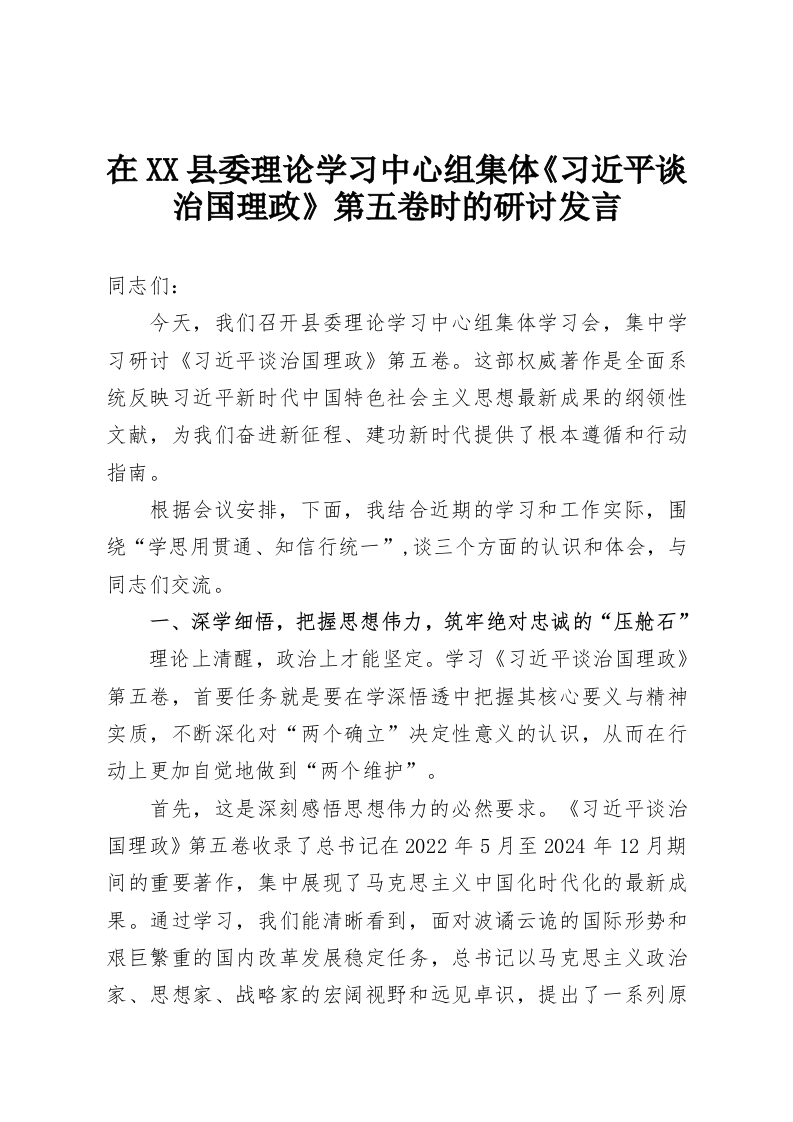 在XX县委理论学习中心组集体《习近平谈治国理政》第五卷时的研讨发言