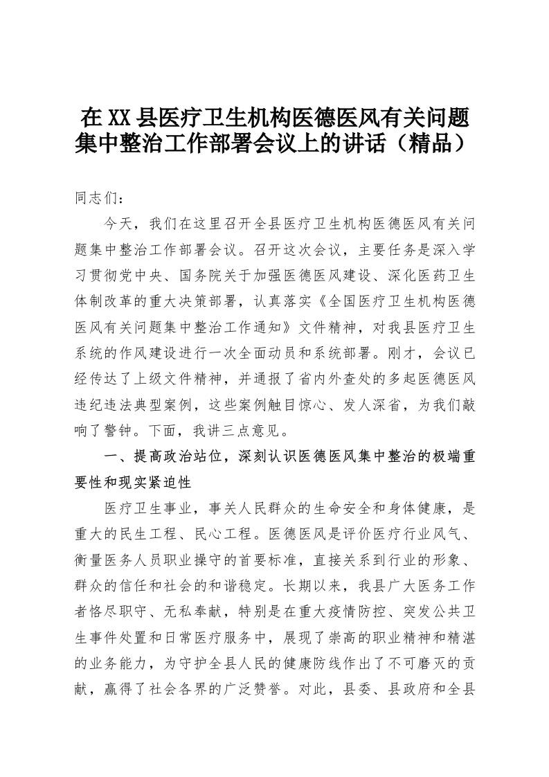 在XX县医疗卫生机构医德医风有关问题集中整治工作部署会议上的讲话(精品)