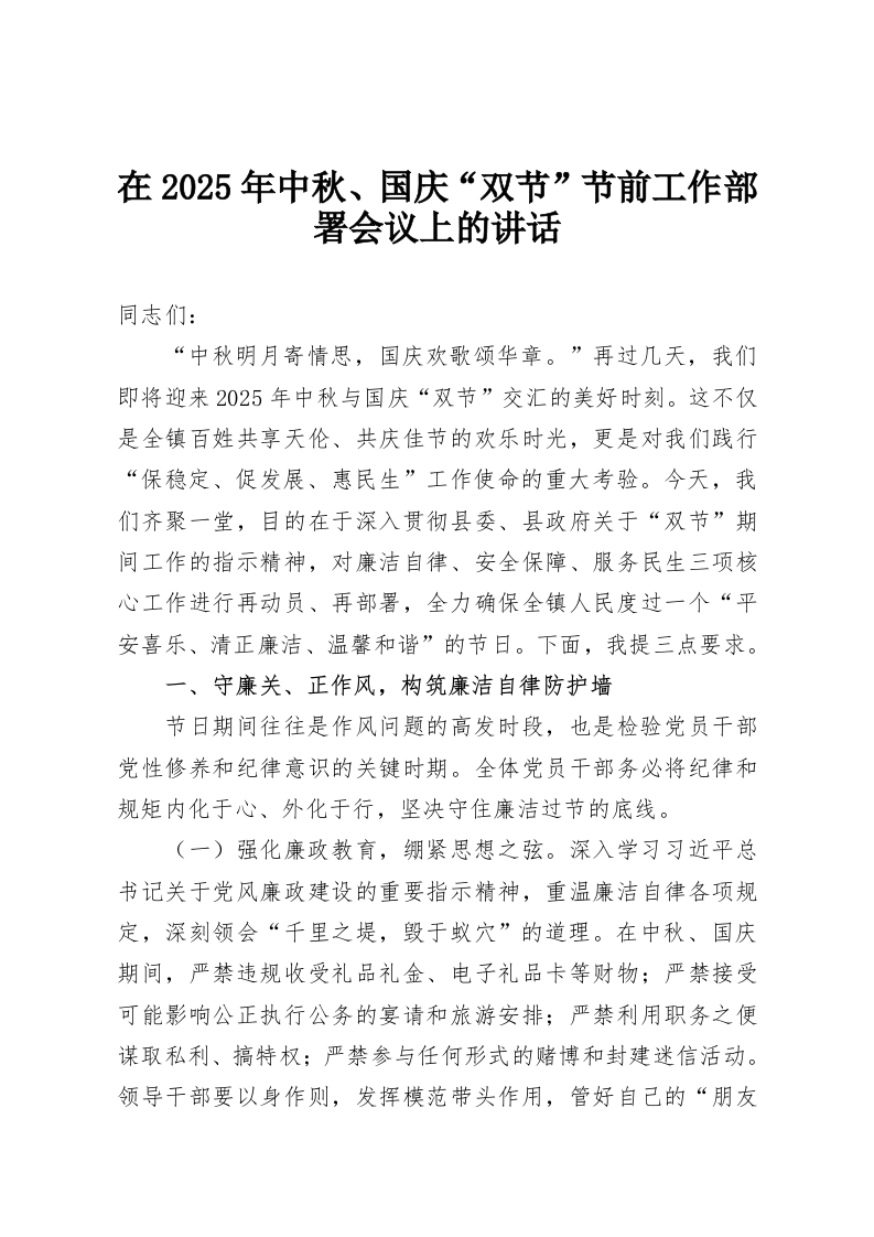 在2025年中秋、国庆“双节”节前工作部署会议上的讲话