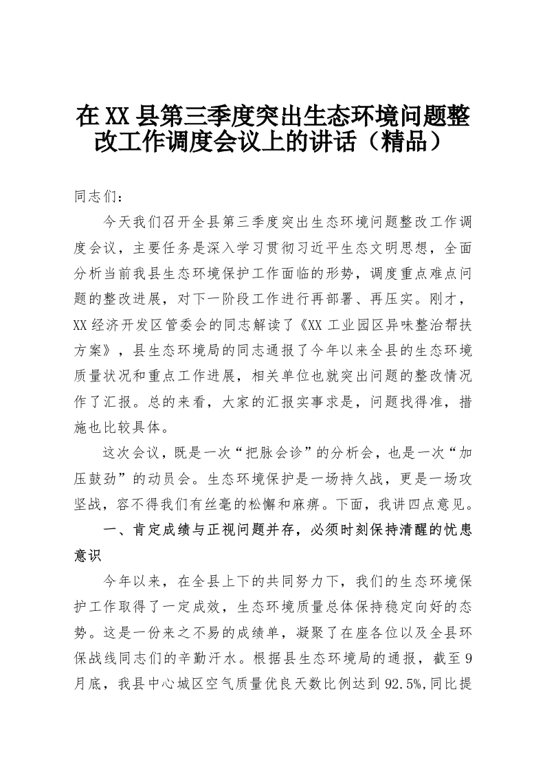 在XX县第三季度突出生态环境问题整改工作调度会议上的讲话(精品)