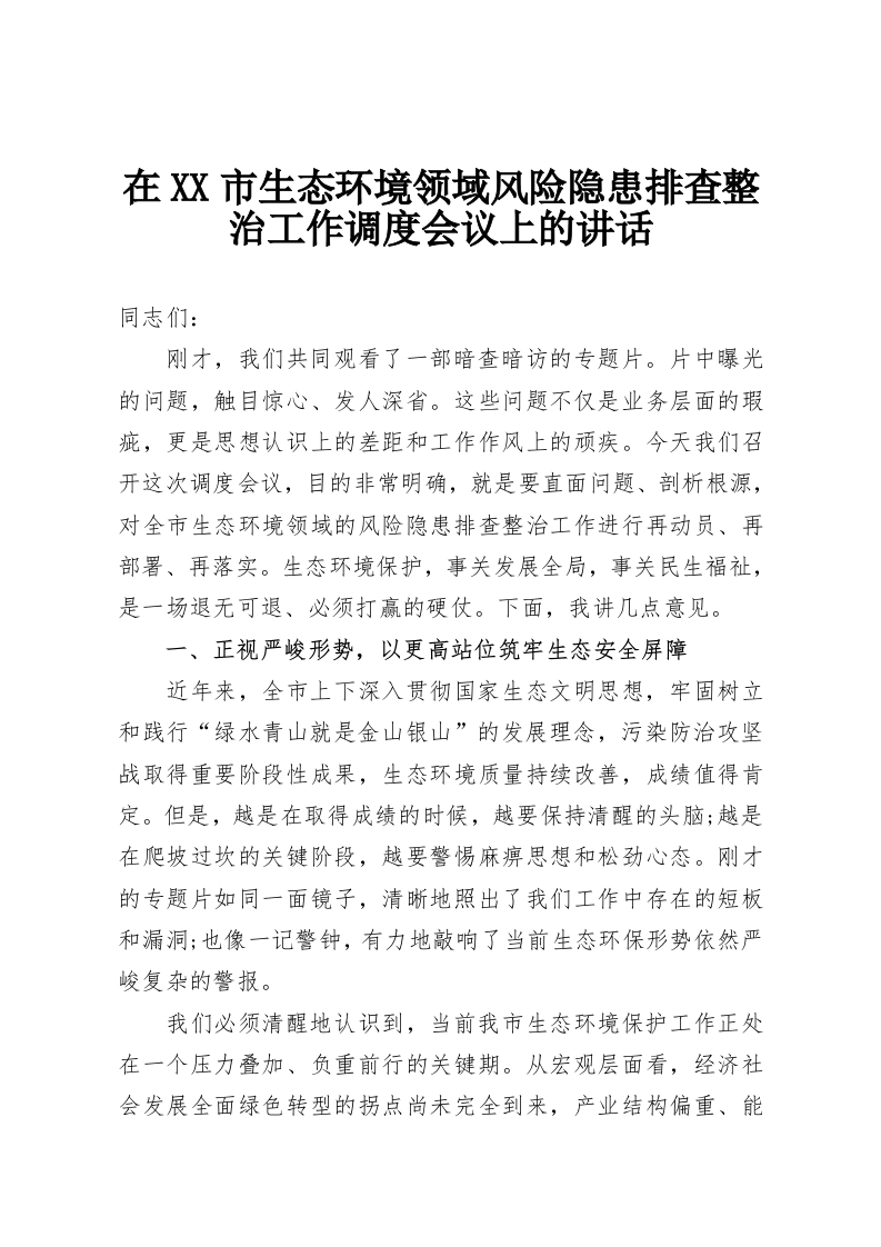 在XX市生态环境领域风险隐患排查整治工作调度会议上的讲话