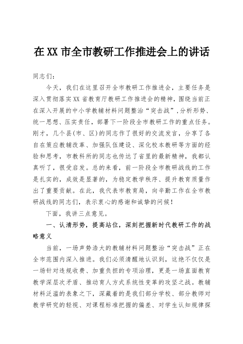 在XX市全市教研工作推进会上的讲话