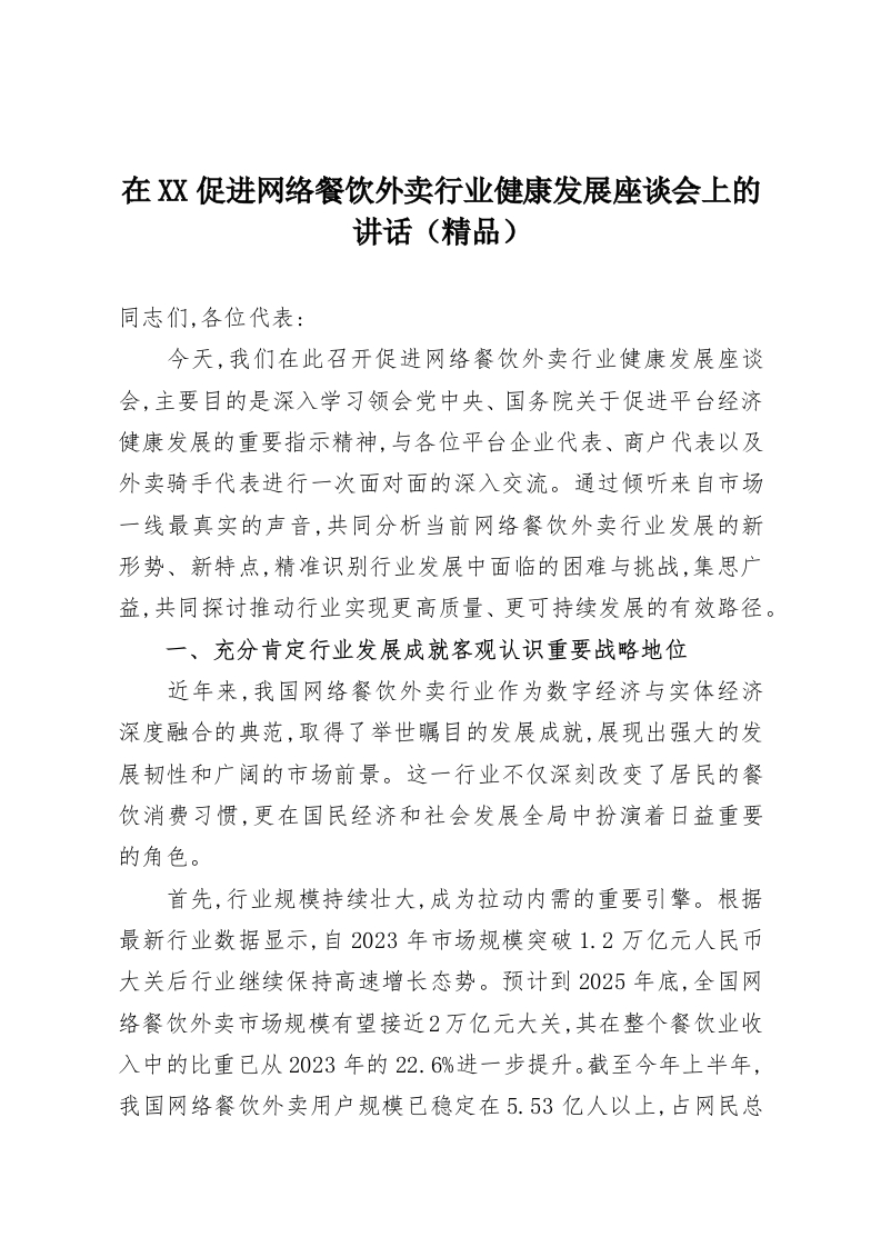 在XX促进网络餐饮外卖行业健康发展座谈会上的讲话(精品)