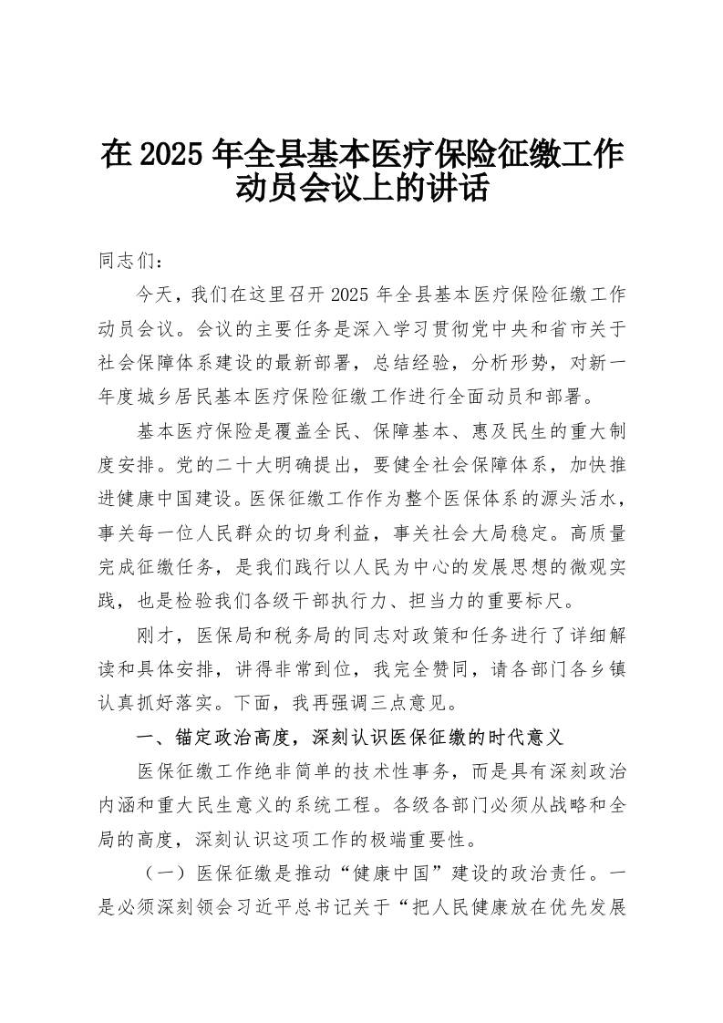 在2025年全县基本医疗保险征缴工作动员会议上的讲话