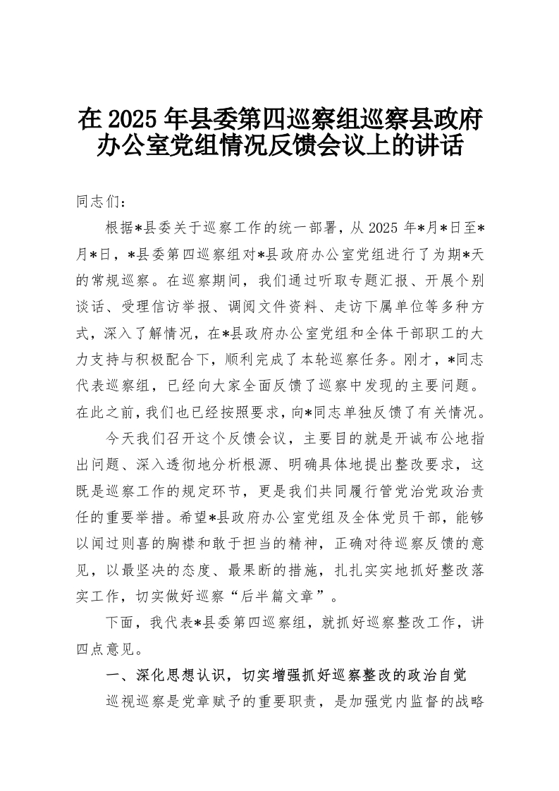 在2025年县委第四巡察组巡察县政府办公室党组情况反馈会议上的讲话