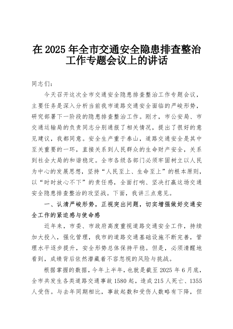 在2025年全市交通安全隐患排查整治工作专题会议上的讲话