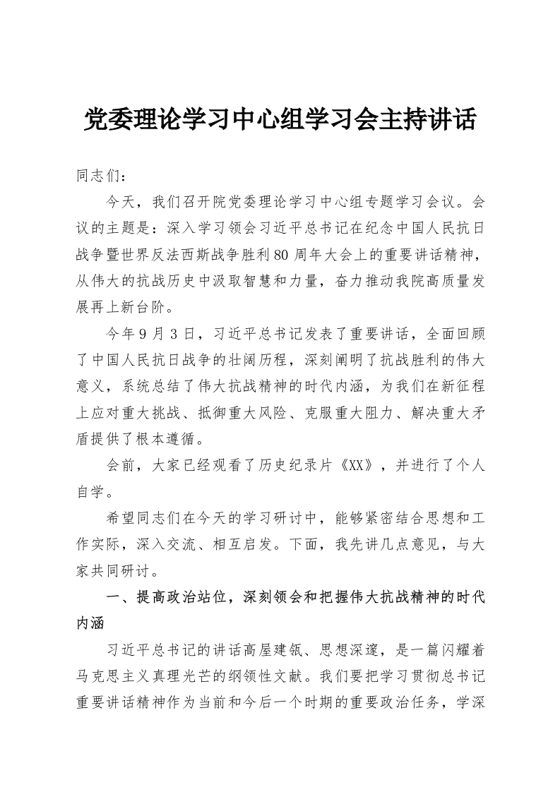 首页公文大全讲话发言党委理论学习中心组学习会主持讲话