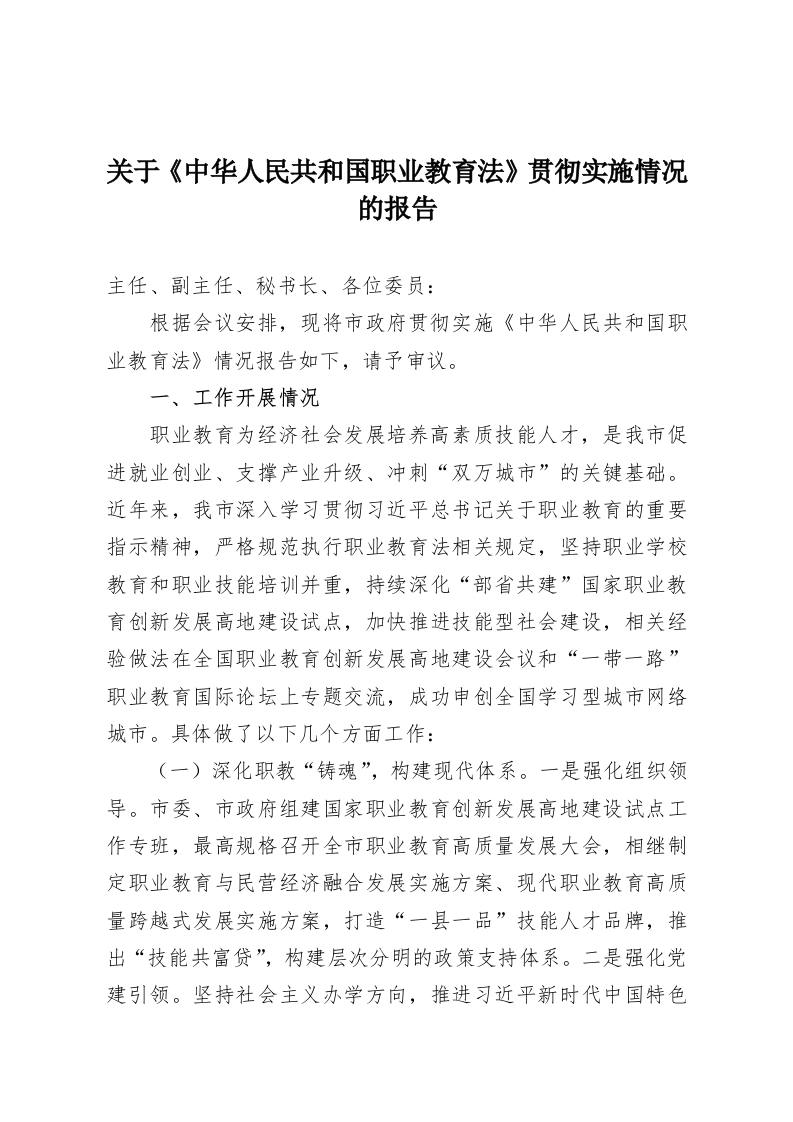 关于《中华人民共和国职业教育法》贯彻实施情况的报告